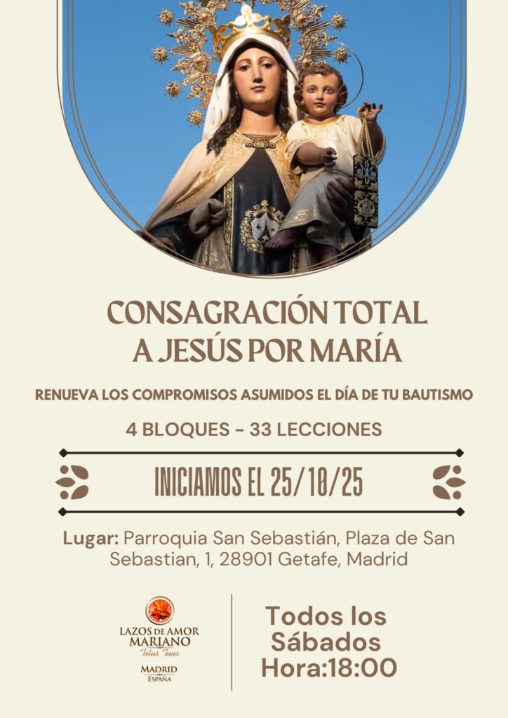 - Hoy en las Misas los miembros del grupo de Lazos de Amor Mariano nos invita participar en la preparación para Consagración total a Jesús por María, que está ayudando a renovar el compromiso bautismal. El grupo va a empezar el sábado, 25 de octubre, a las 18:00 horas en los salones parroquiales. Más información en la web y en los carteles.