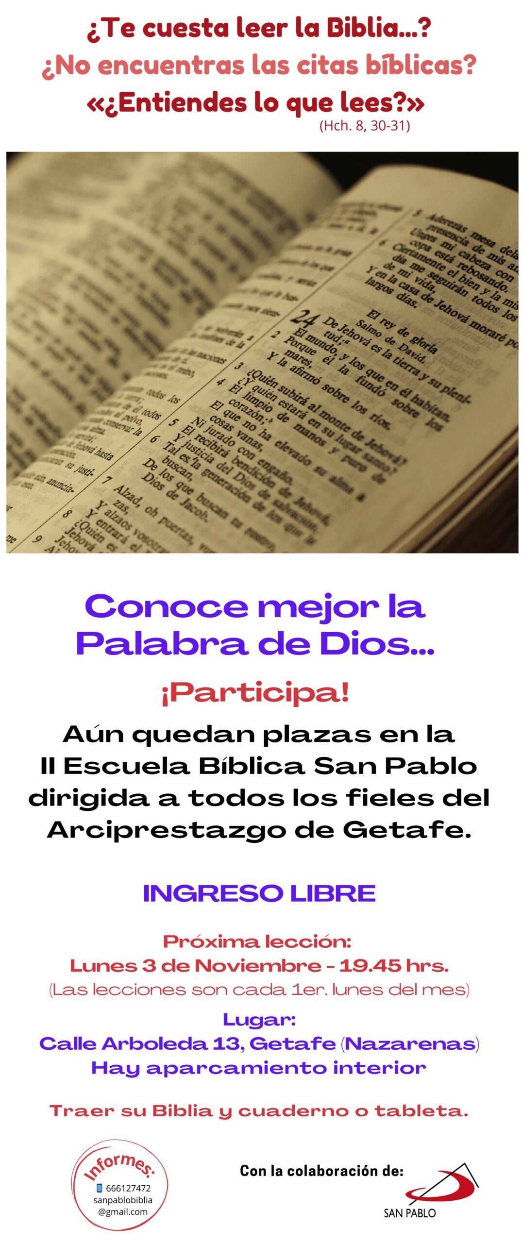 Aún quedan plazas en la II Escuela Bíblica San Pablo dirigida a todos los fieles del Arciprestazgo de Getafe. INGRESO LIBRE